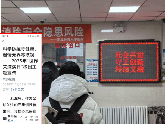 活动前期,校医院通过微信公众号推送系列科普文章,辅导员们借助工作群广泛转发活动通知与防艾常识,两校区悬挂的宣传条幅、张贴的科普海报、电子屏的滚动播放,提前营造出“人人知艾、人人防艾”的浓厚氛围。